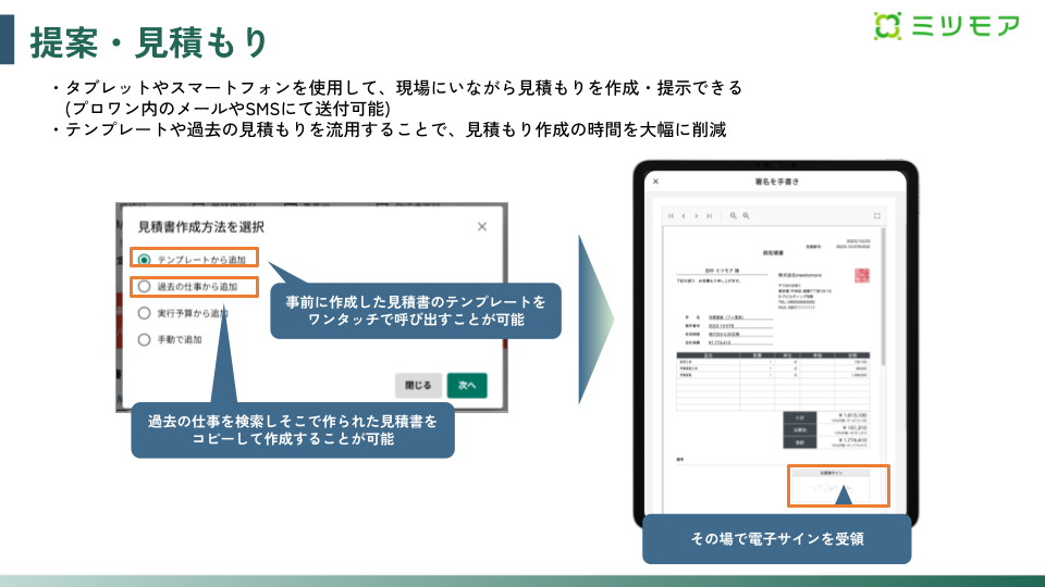 杉山様:最近入社した作業員からも「とても使いやすい」という声が上がっています。わざわざ事務所に戻らなくても、スマホ1台で見積もり作成ができるので、移動時間や待機時間を有効活用でき、非常に便利になったようです。これまでは見積もり作成のためだけに帰社することもあったので、その無駄な時間がなくなったのは大きな進歩です。