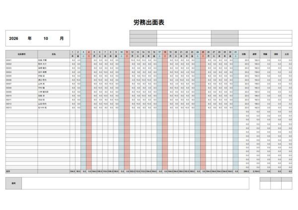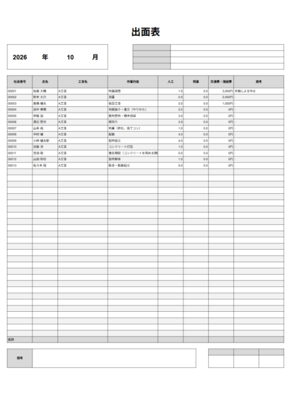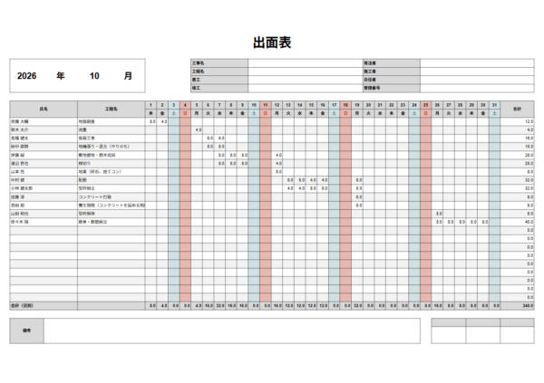 | 出面表エクセル(労務) | 個人の日数や勤務時間、残業時間などを集計した労務向けの出面表です。 | ![]() |