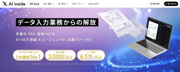 | AI inside(DX Suite) | 手書き文字の認識精度が高く、100種類以上の帳票に対応 | 申込書や契約書など、手書き書類が多い企業向け |