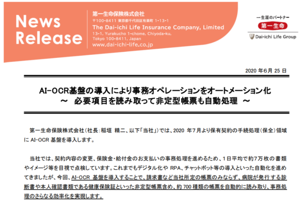 ※ 第一生命保険株式会社「AI-OCR基盤の導入により事務オペレーションをオートメーション化」