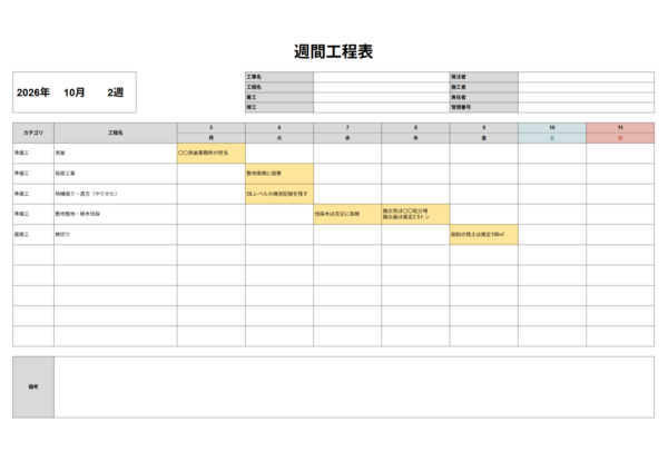 1週間分のスケジュールが把握できるテンプレートです。縦に「カテゴリ、工程名」を記入し、日にちのセルには内容を追記できます。こちらのテンプレートもボタンを押すだけでダウンロードできて、すぐに使い始められます。