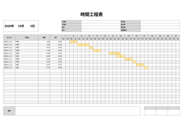 1日分のタスクを時系列で記入できるテンプレートです。記入欄は「カテゴリ、工程名、開始、終了」であり、イベントなどで30分~1時間単位で業務が変わるスケジュールを決めるときに使えます。