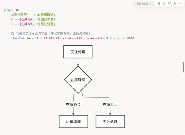 - 最初に「今から業務フローを伝えるので、Mermaid形式に変換してください」と話す