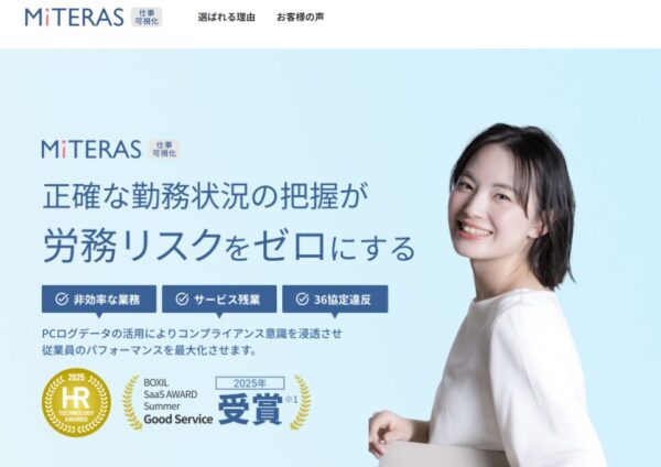 | MITERAS仕事可視化 | 月額210円/人~ | 1分単位のPC操作ログ取得により、勤務時間と作業時間の突合せができる | サービス残業の防止や、テレワーク時の隠れ長時間労働の発見 |