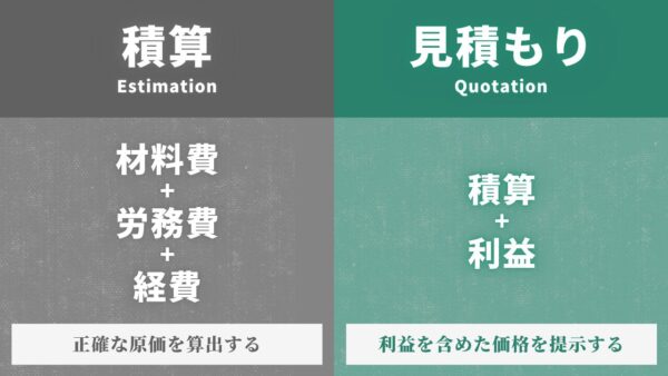 | 定義 | 図面に基づき工事の「原価」を算出する | 積算額に利益を上乗せし「販売価格」を出す |