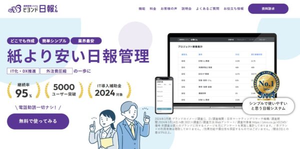 ビヨンド日報くんは、その名の通りシンプルさを追求した作業日報アプリです。導入企業の95%が「継続」しているほど、使いやすさに定評があります。