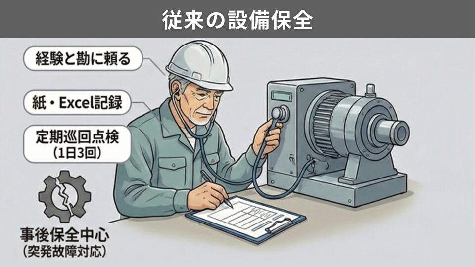 これまでの設備保全では、ベテラン技術者が機械の音や振動を五感で感じ取り、「そろそろ危ないかもしれない」という経験則で判断していました。点検記録は紙の帳票に手書きで記入され、月末にExcelに転記する作業をしている企業もあります。