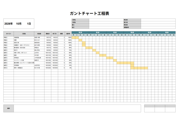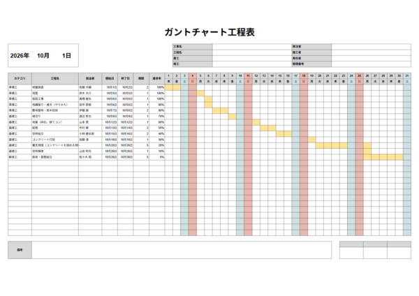 日々の具体的な作業予定を詳細に把握できるため、特に現場での作業指示や短期的な進捗管理をする際に非常に有効です。曜日や祝日の情報を含んでいるため、リソースの割り当て計画の精度を上げるのに貢献します。