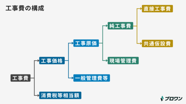 さらに「工事原価」は、現場事務所の経費などである「現場管理費」と、工事の主体となる「純工事費」に分類され、この「純工事費」が材料費などの「直接工事費」と共通の仮設費用「共通仮設費」から成り立っています。