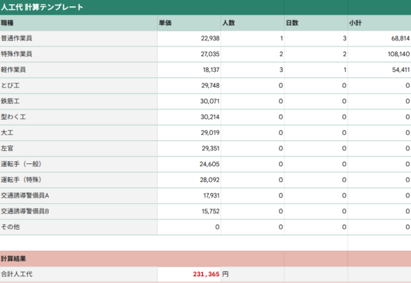 現場の人工代を職種別に計算できるようにしました。職種別にあらかじめ入力されている数値は、国土交通省の公共工事設計労務単価(2025年3月版)と同じ数値を使用していますので、参考値としてお使いください。
