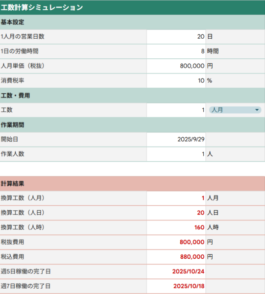 そこでプロジェクトの人月、費用、期間などをシミュレーションできるようにしました。「1人月は何人日に相当する?」「作業人数を増やしたら完了日はいつ?」といった疑問を明らかにできます。
