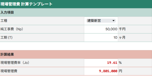 例えば、工種が「建築新営」、純工事費が「50,000千円」、工期「10ヶ月」を例に取ると、現場管理費率は国土交通省の積算基準に基づいて「19.61%」となります。