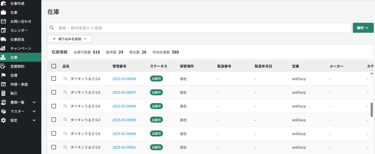| 現場 | 発注書の出力・送付・ステータス管理、機器・資材管理、協力会社への受発注管理、現場アプリでの即時対応 |